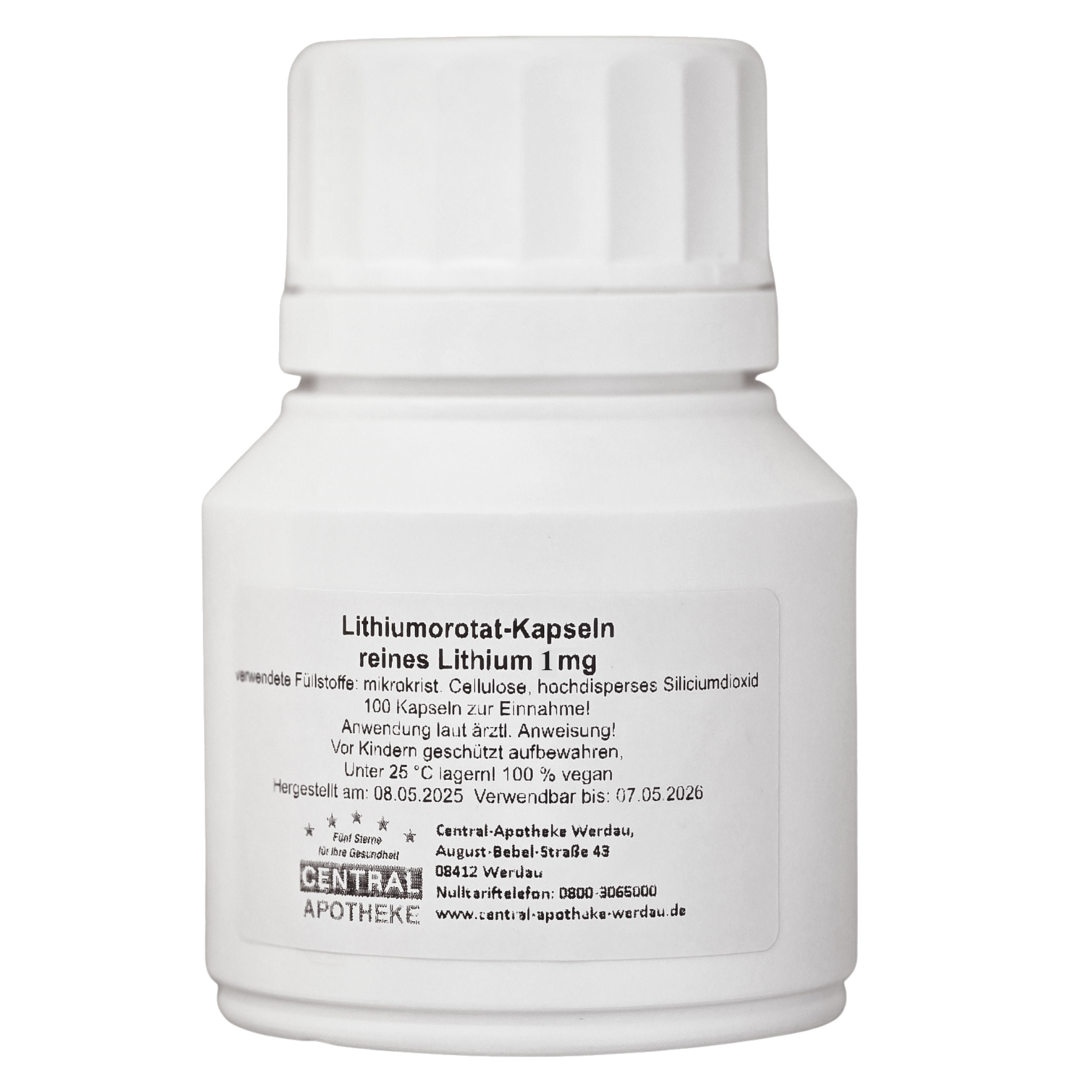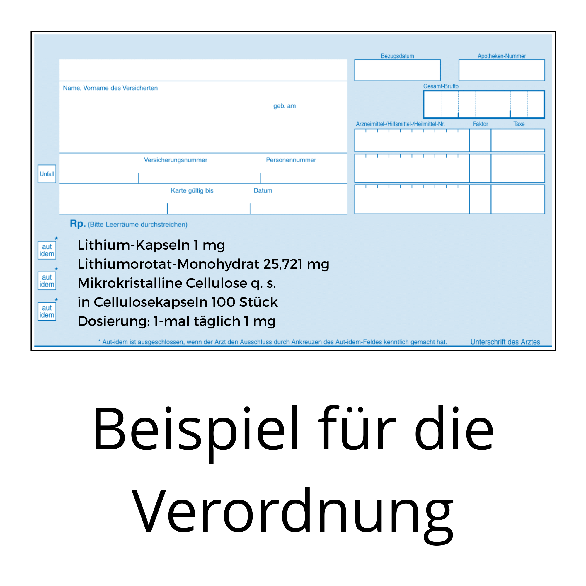 Unsere Lithium-Kapseln enthalten Lithiumorotat in festgelegter, niedriger Dosierung. Die Abgabe erfolgt ausschließlich gegen Privatrezept. Hintergrund: Lithium ist in der EU nicht als Nahrungsergänzungsmittel zugelassen; Apotheken stellen es daher als Rezeptur her – mit exakt definierter Dosis nach ärztlicher Anweisung.